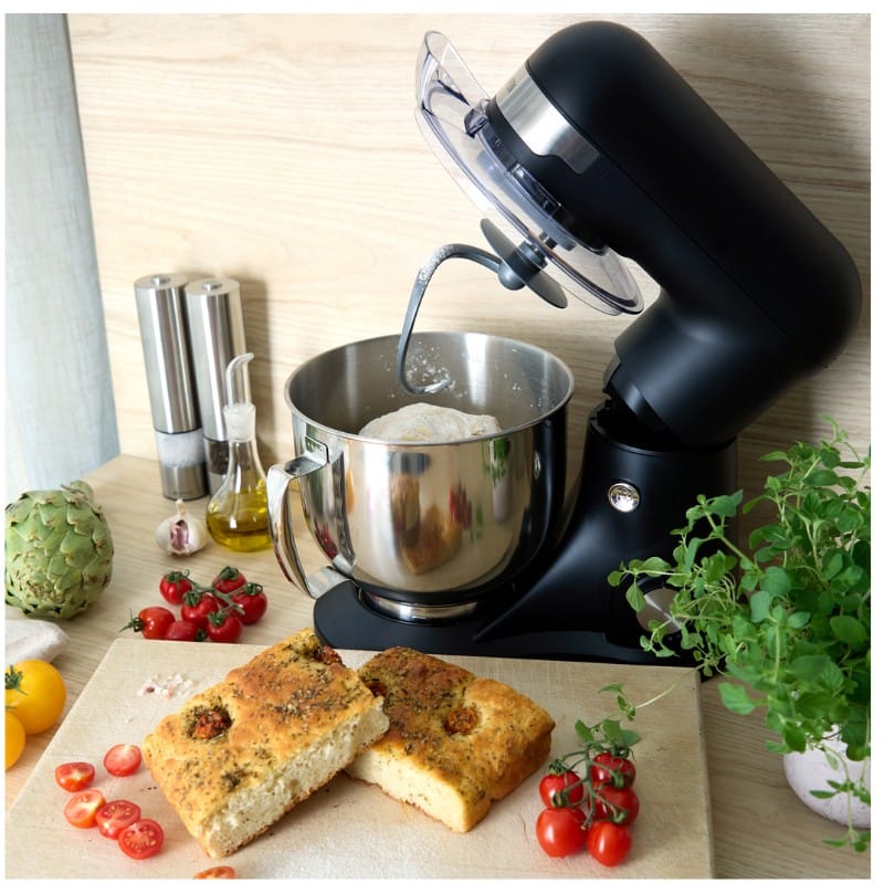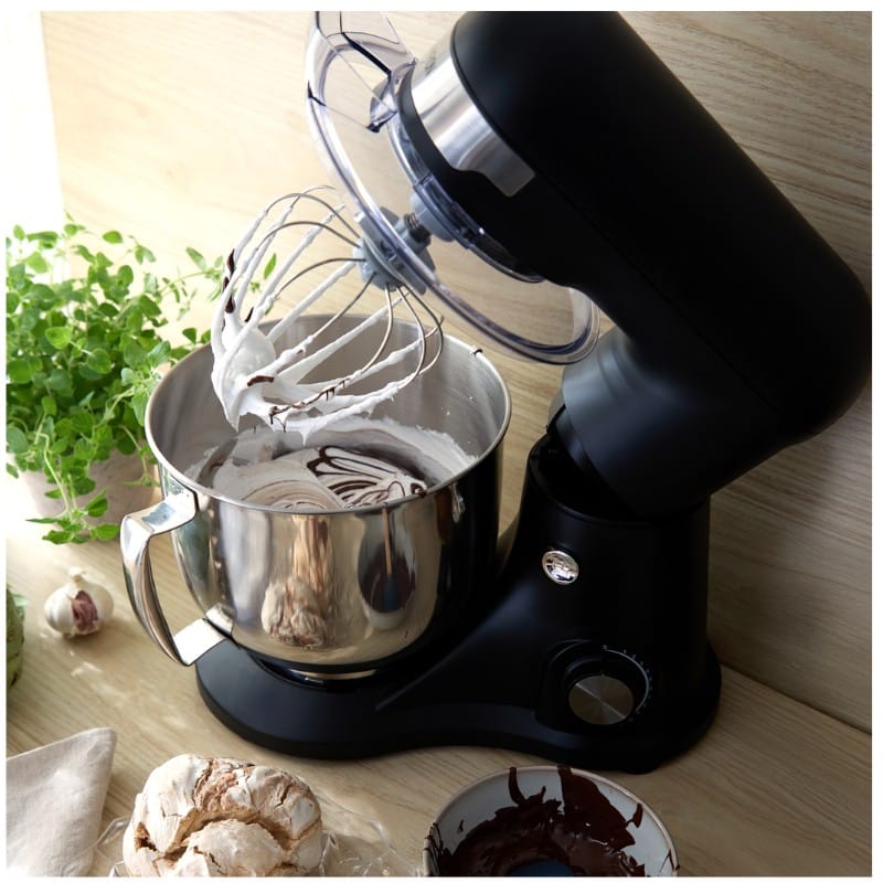 – Tillbehör: stänkskydd, visp, degkrok och spatel