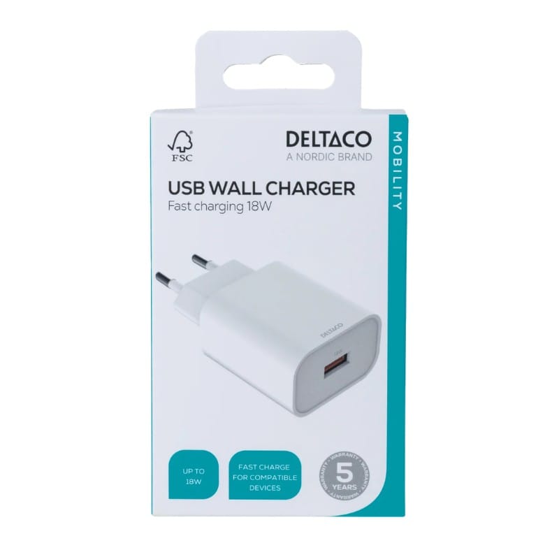 DELTACO USB-väggladdare har en USB-A-port med en total effekt på hela 18 W. Oavsett om du behöver en extra laddare eller om du vill uppgradera din vanliga USB-A-laddare, är den här laddaren något för dig. Självklart är väggladdaren optimerad med säkerhetsfunktioner så som: temperaturkontroll, överströms-, överspännings-, kortslutnings- och överspänningsskydd.