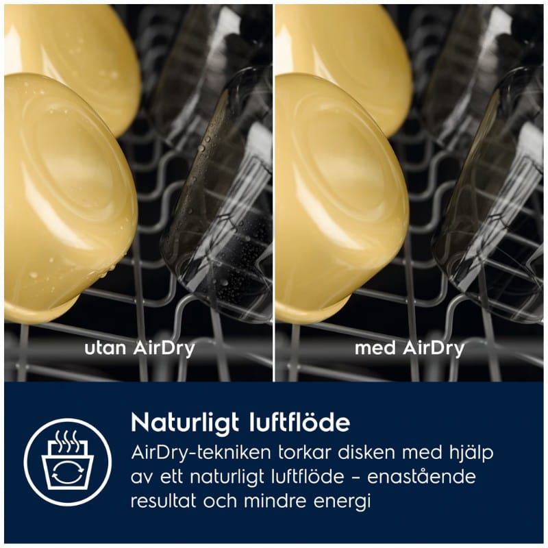 Vår 300 AirDry-diskmaskinsteknik avslutar varje program med frisk luft, vilket är tre gånger bättre än slutna lucksystem. Luckan öppnas automatiskt under torkningsfasen och luften gör att tallrikarna och besticken blir helt torra.