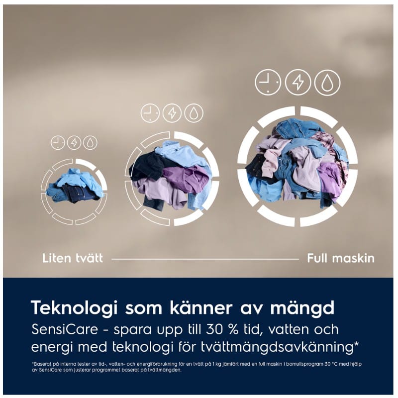 *Baserat på interna tester av tid-, vatten- och energiförbrukning för en tvätt på 1 kg jämfört med en full maskin i bomullsprogram 30 °C med hjälp av SensiCare som justerar programmet baserat på tvättmängden.