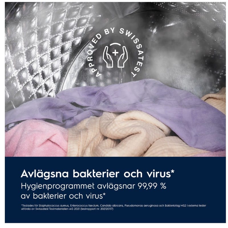 Hygienprogrammet, som har certifierats av Swissatest, kombinerar ett tvättprogram och ånga för att ta bort mer än 99,99 % av bakterier och virus* genom att hålla en temperatur över 60 °C. Dessutom minskar mängden pollen och allergener i kläderna.