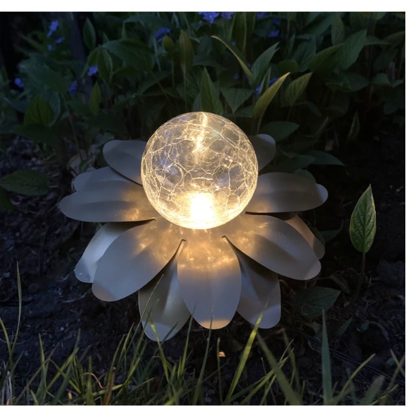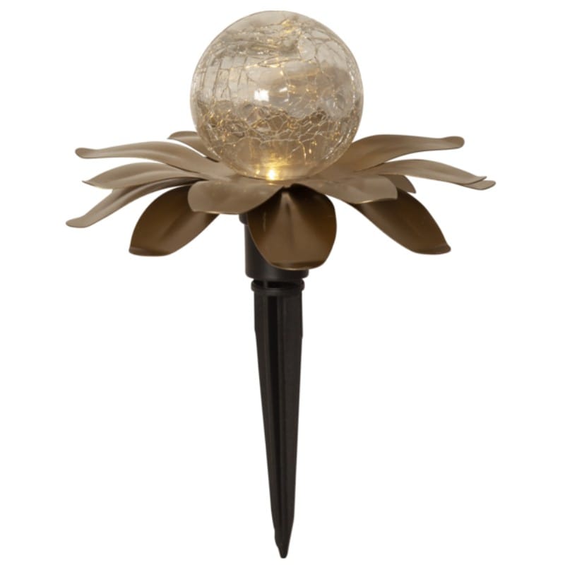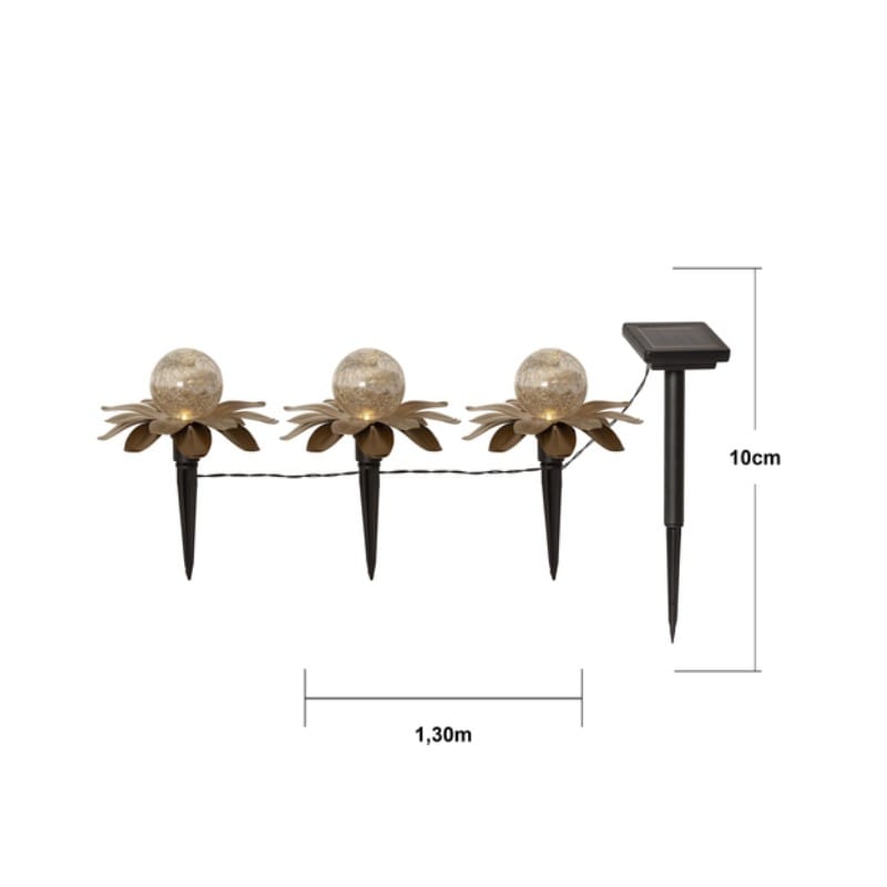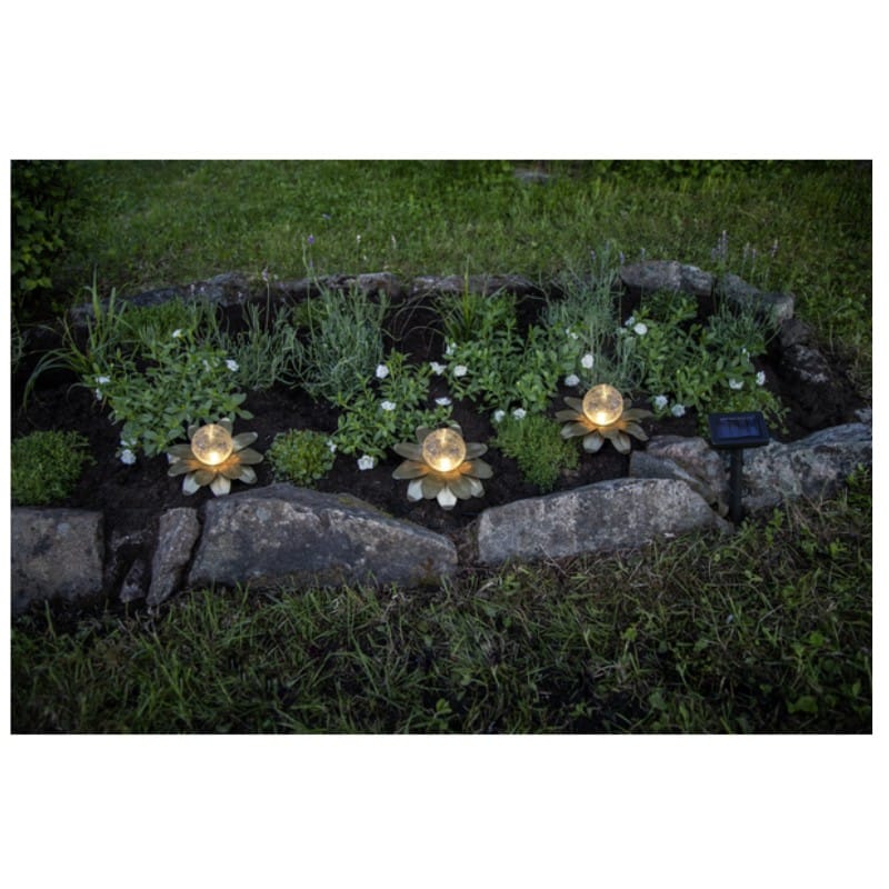 Vackra solcellsdrivna dekorationen Lilly har 3 dekorationer som består av guldfärgade metallöv med en glaskula inuti. De är ca 15 cm i diameter och 10 cm höga. De lyser med ett varmvitt sken genom glaskulan.